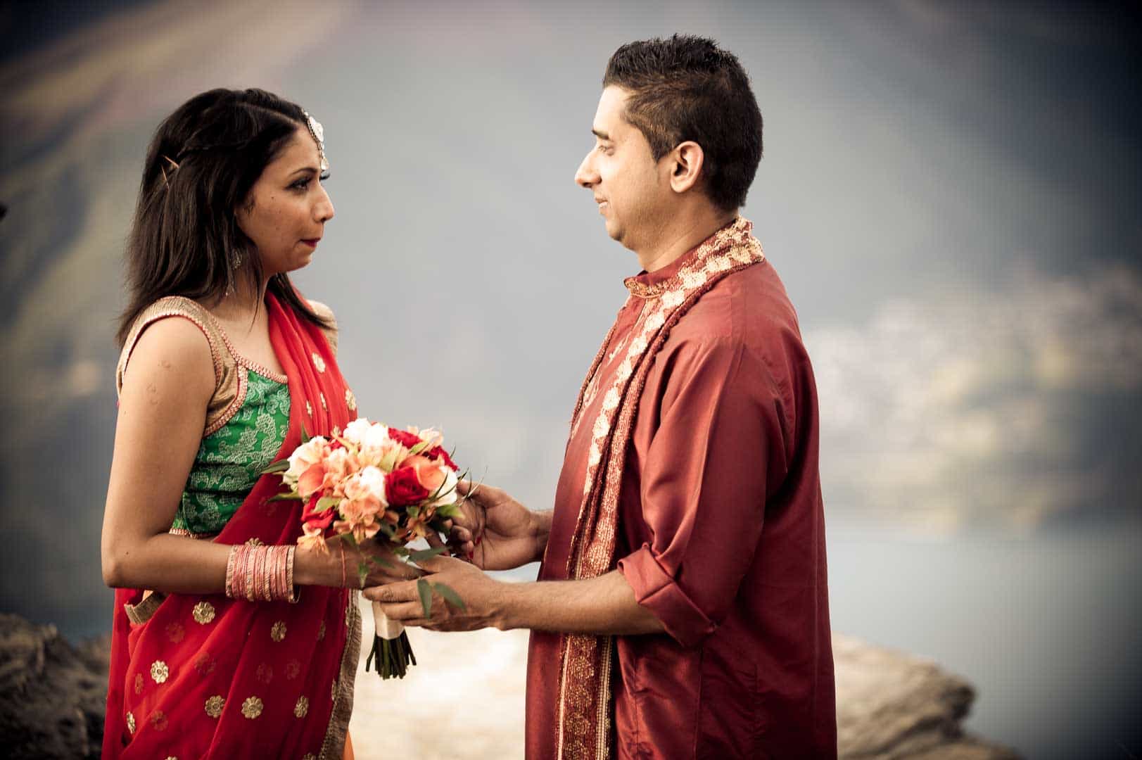 Rav & Shirlene’s sunset heli-wedding was a perfect example of this. Originally when Rav got in touch with me they were planning a sunrise heli-wedding at The Ledge on Cecil Peak on the 12th of December. However, the lovely guys and girls at Heliworks were watching the weather like hawks (as they do) and being the super-proactive switched on people that they are suggested to Rav and myself that we bring the heli-wedding forward a day and do a sunset shoot instead (Rav and Shirlene were only arriving into town that morning). Luckily super-celebrant Kathryn Omond and myself were both free, we did a bit of schedule-jiggling and made it work.